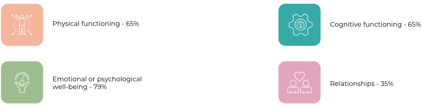 Life with mBC may bring changes to many aspects of your daily routine impacting your overall quality of life. A recent ABC Global Alliance 2024 patient survey revealed that 62% of the 1,254 respondents, all with advanced breast cancer, reported the disease having a negative impact on their overall wellbeing, including the following areas: 2